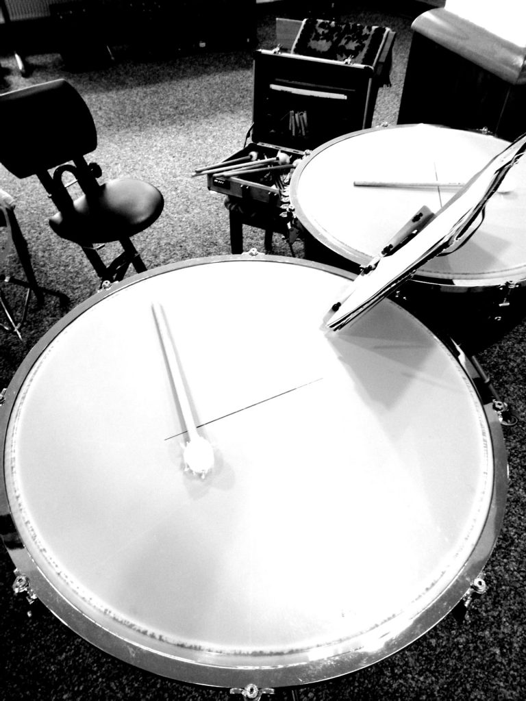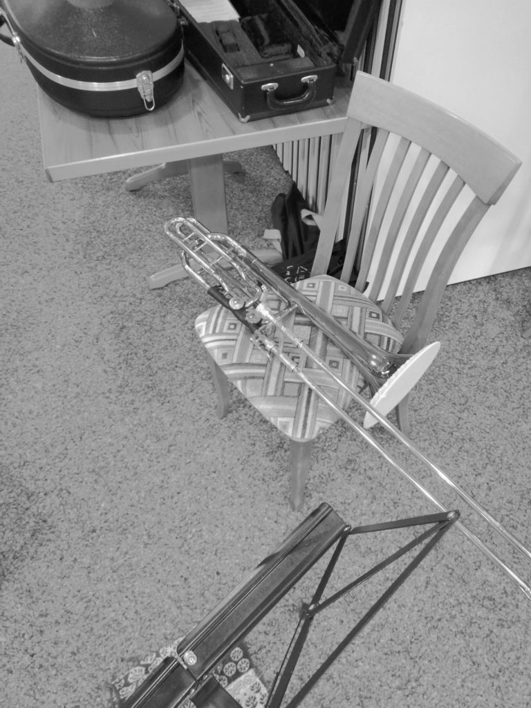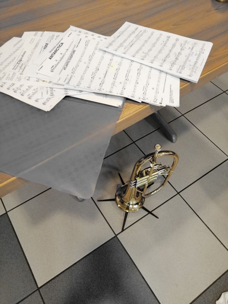 Notizbuch, Kaffeetasse und Trompete auf einem Tisch mit Notenblättern – stimmungsvolle Vorbereitung auf die Chorprobe im Klaukenhof