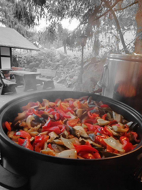 Hier gibt es wie zur Guten Alten Zeit ein Gericht für alle, mit echten Zutaten aus unserem Umfeld. Eier und Kartoffeln liefert der Steinhoffs Hubertus aus dem Burbecker Oberdorf, Honig unser Nachbarimker der Voss Michael, das Fleisch der Metzger Börgers Bernd aus Elspe und Brot/Brötchen unser Bäcker, der Brinkers Thomas aus Oberelspe. Das Wildfleisch kommt natürlich aus der Eigenjagd des Hofes.